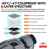 • 2. COLDPROOF & WATERPROOF & BREATHABLE - 6-layer structure for coldproof down to -20℃/-4°F. The TPU waterproof membrane along with the 3M Thinsulate insulation C150 lining with superior warmth is moisture-wicking and breathable. Elastic cuff closed around your hands to fasten your clothes and keep snowmelt and cold wind out. Buckles on the wrist to prevent gloves from falling off and offer a more secure, comfortable fit. Anti-lost buckle for easy storage